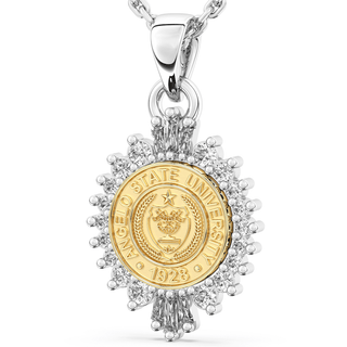 The Honor 311 necklace features a unique halo of round stones, with stunning baguette stones on the top and bottom, giving the round seal a more oval-shaped look. This Angelo State University necklace is regal and eye-catching, with great sparkle.
