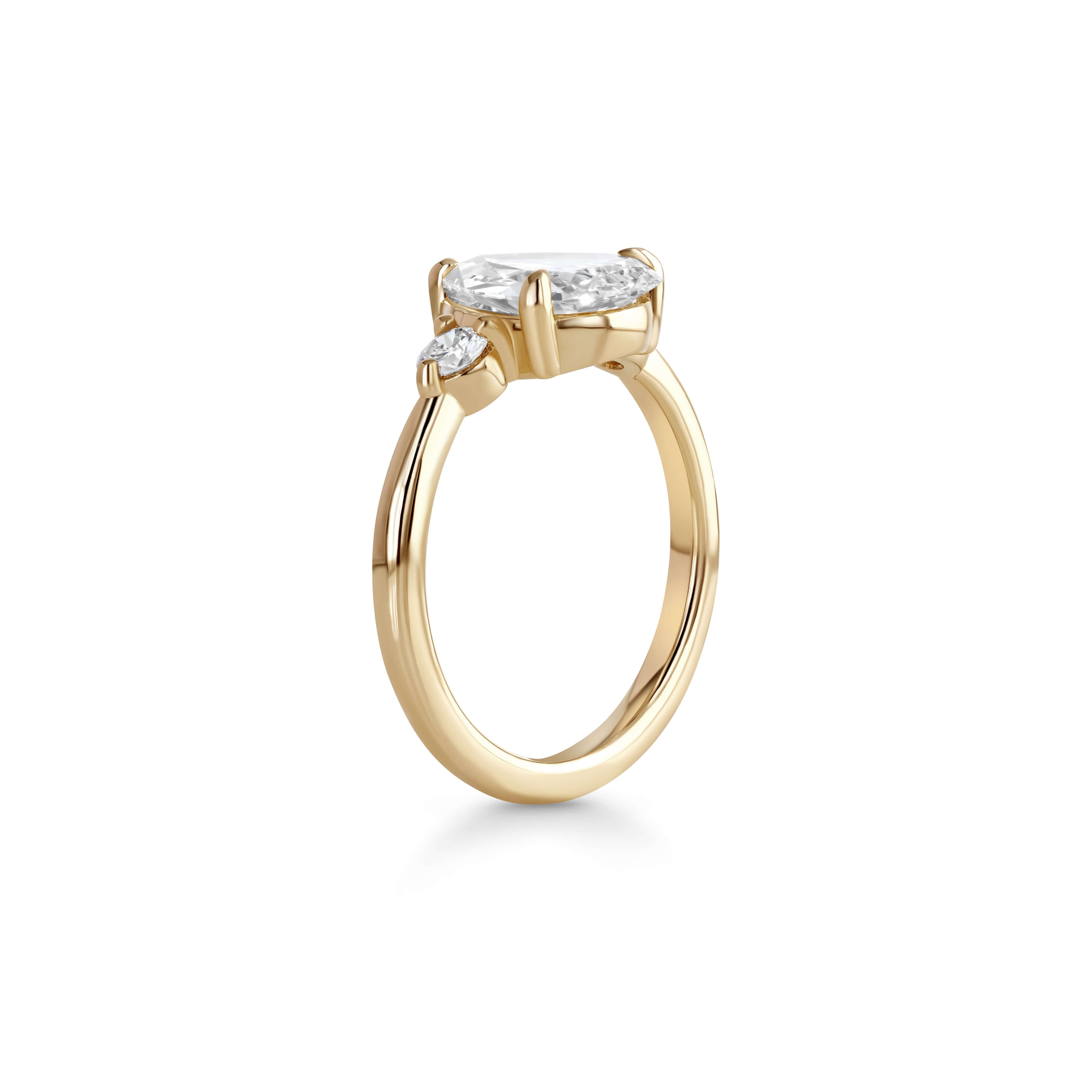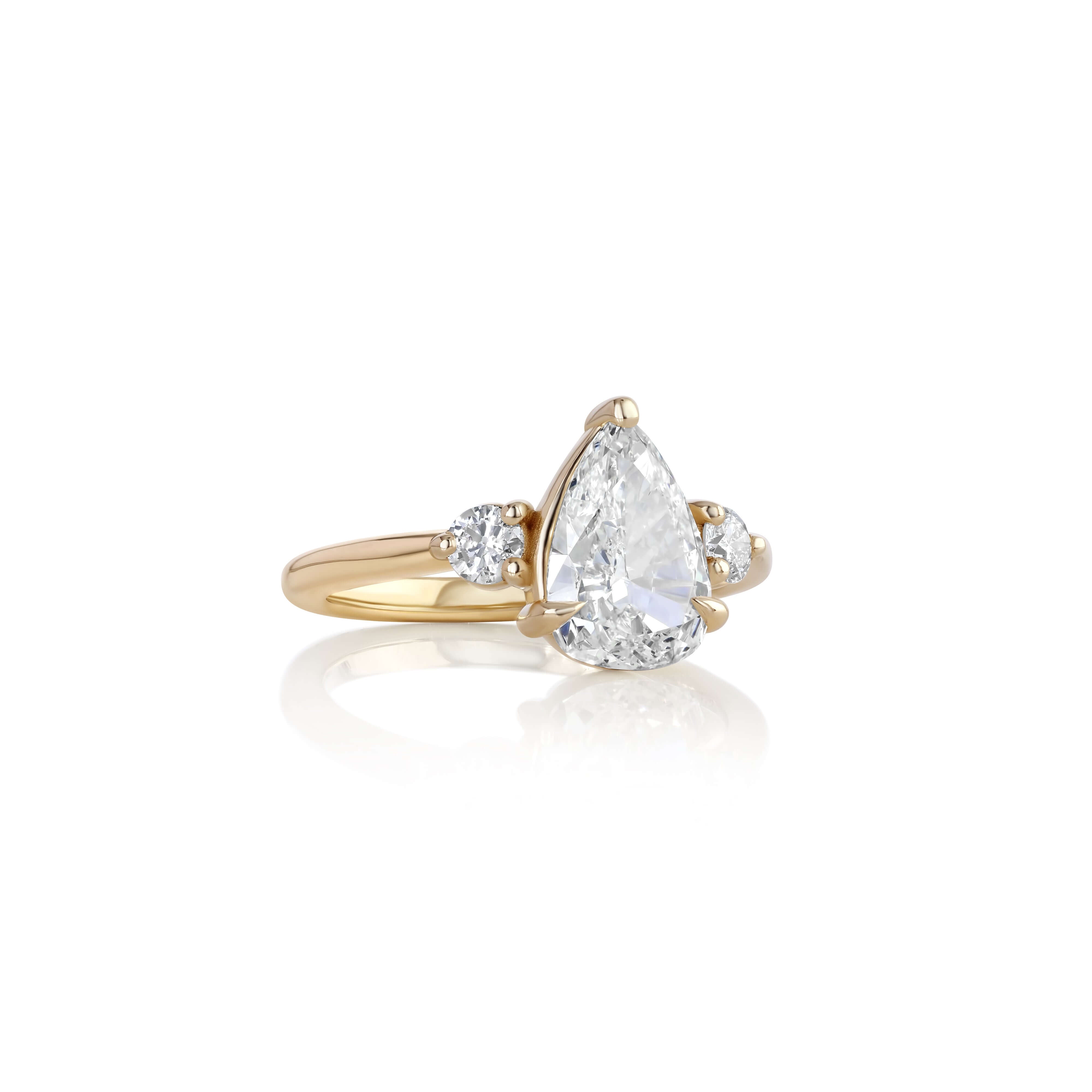 The 1.19 carat natural, earth-mined pear diamond takes center stage, offering a unique shape that elongates the finger and catches light from every angle. Flanking the center stone are round diamond side stones, adding subtle sparkle and balance to the design.