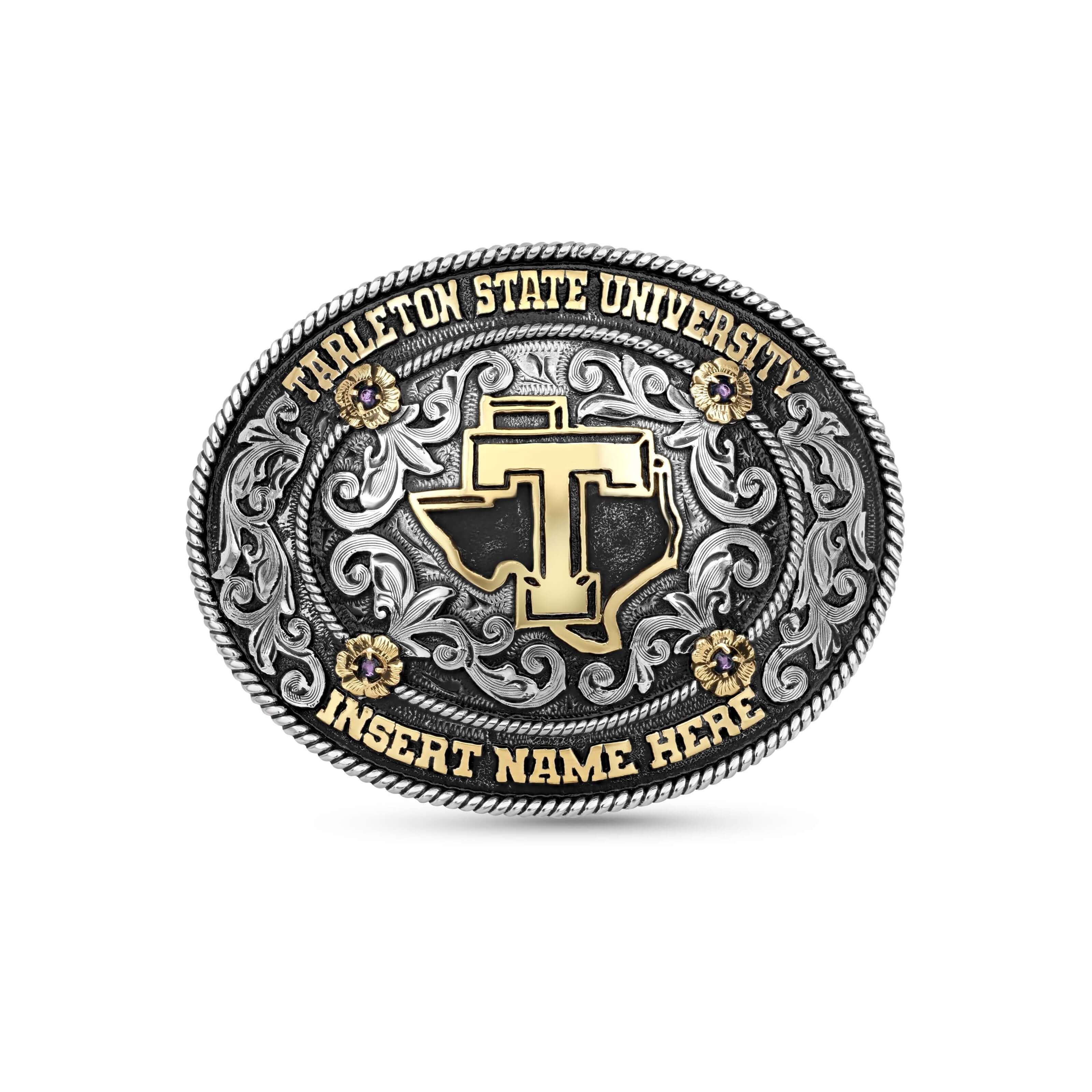 Crafted with a rugged antique german silver finish and gold-tone accents, this Tarleton belt buckle delivers classic western heritage with collegiate pride. The customizable name banner at the bottom makes it a perfect personalized gift for students, graduates, ranchers, rodeo fans, and proud Texans alike.