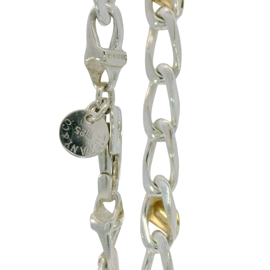 Experience the perfect marriage of classic craftsmanship and modern luxury with this stunning Tiffany & Co. Two-Tone Cuban Link Bracelet. This iconic piece seamlessly blends the cool, polished finish of .925 sterling silver with the warm, rich glow of 18k yellow gold accents, making it a versatile powerhouse for any jewelry collection.