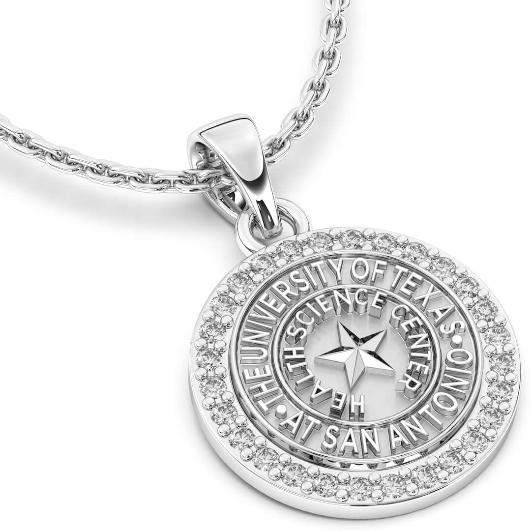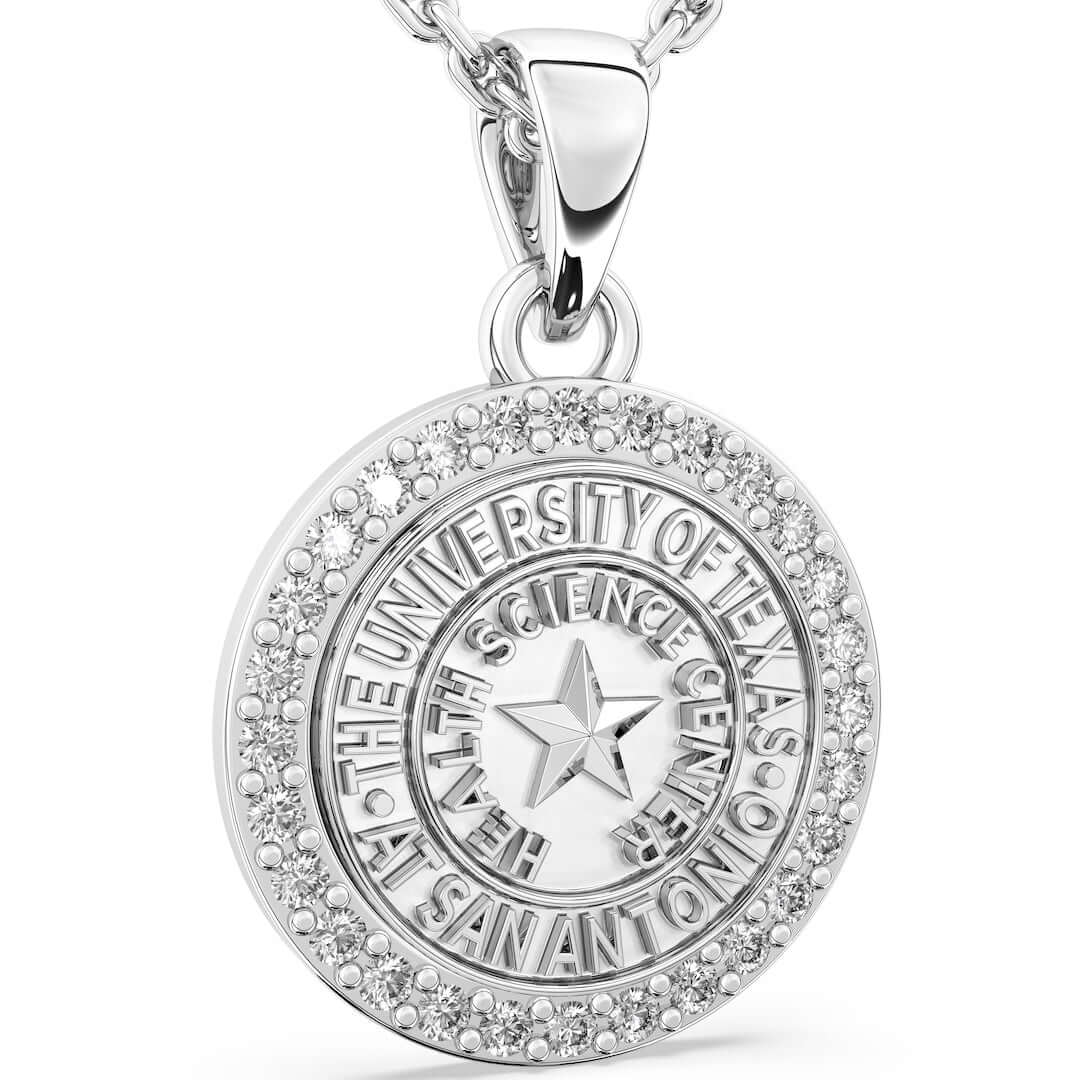 The Eternity 249 necklace features a halo of 1.25mm stones that perfectly fit around the seal. This UTHSC San Antonio necklace has a delicate, subtle look and an elegant sparkle.