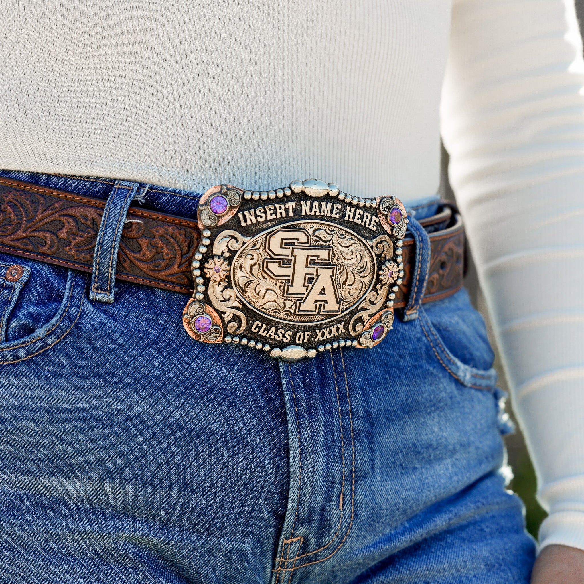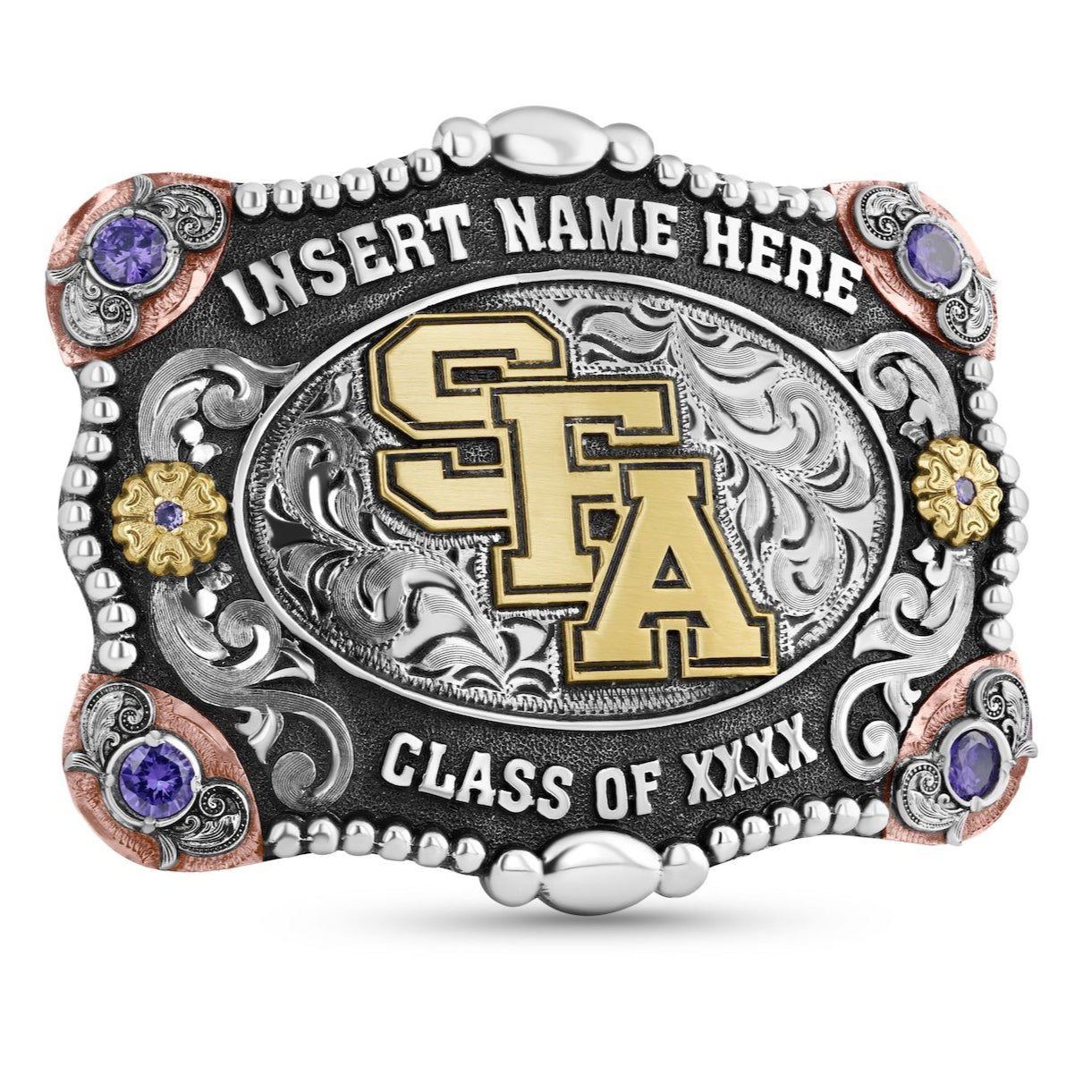 Wear your SFA pride with "The Spur" – a symbol of accomplishment, community, and school spirit. This graduation belt buckle from San Jose Jewelers will surely be a cherished memento for students and alumni alike.