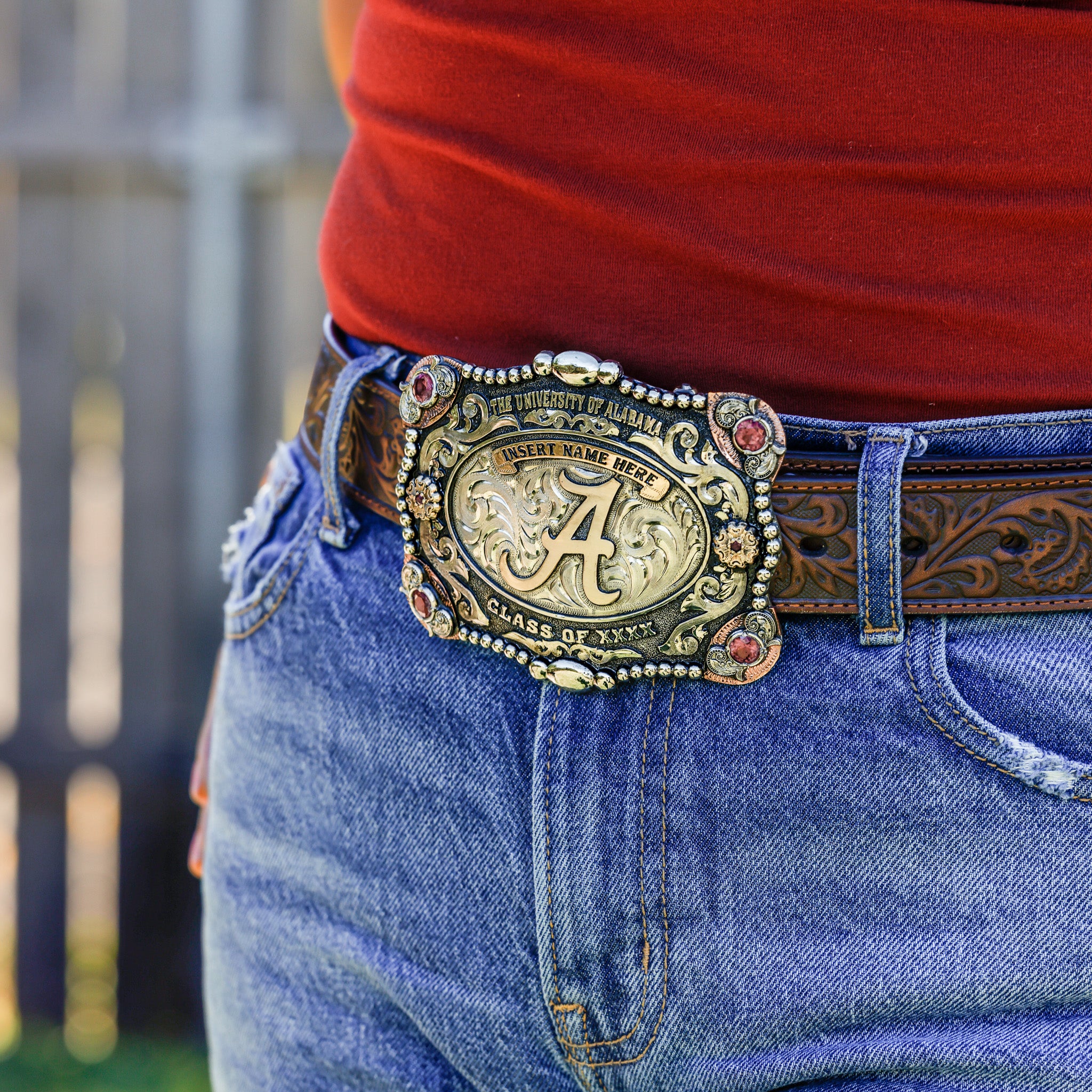 Introducing "The Spur" college belt buckle. Proudly crafted by San Jose Jewelers, this class buckle is tailored for University of Alabama's vibrant students and alumni, capturing the essence of tradition and individuality. "The Spur" is a unique and meaningful accessory designed for personalization. Customize "The Spur" buckle with your name and graduation year!