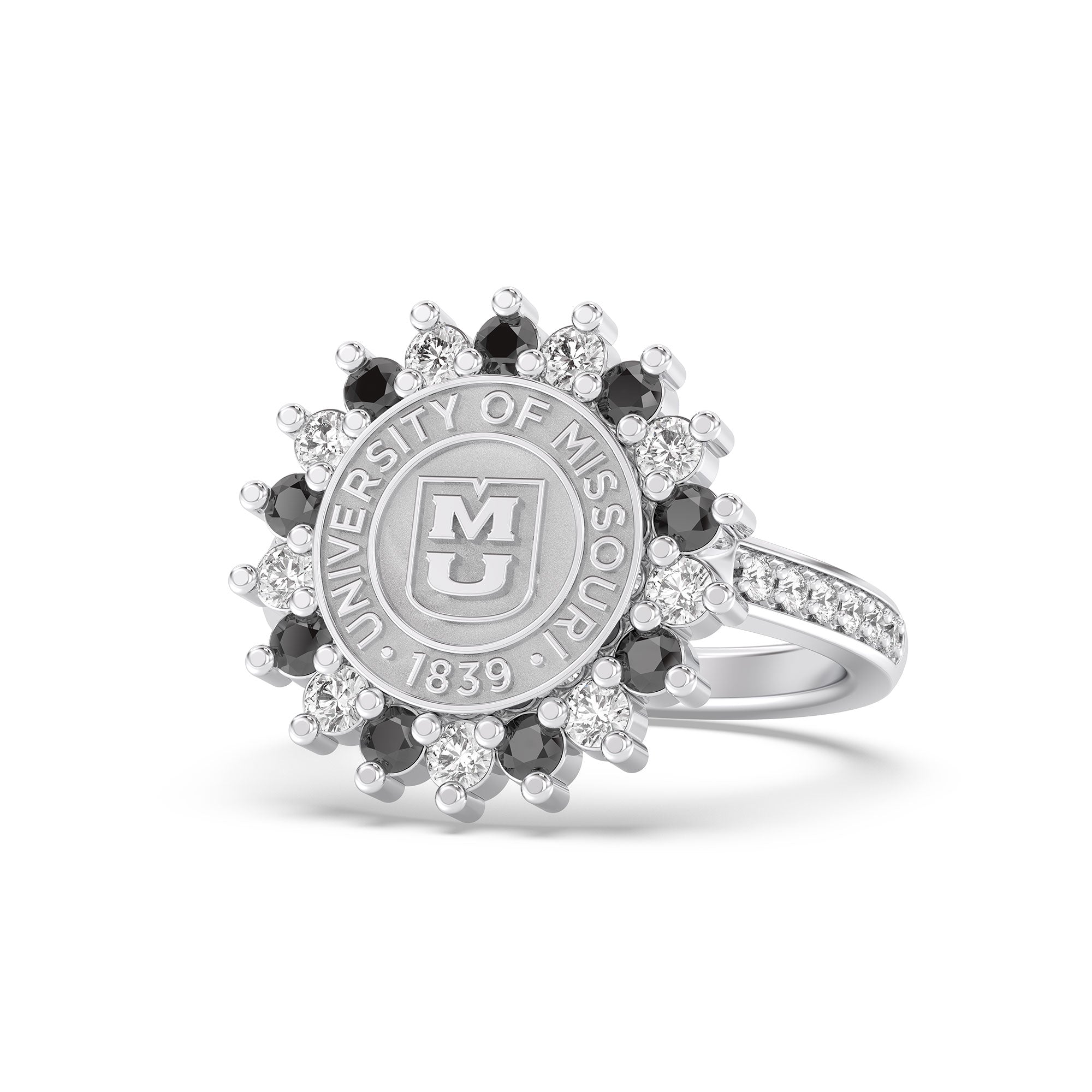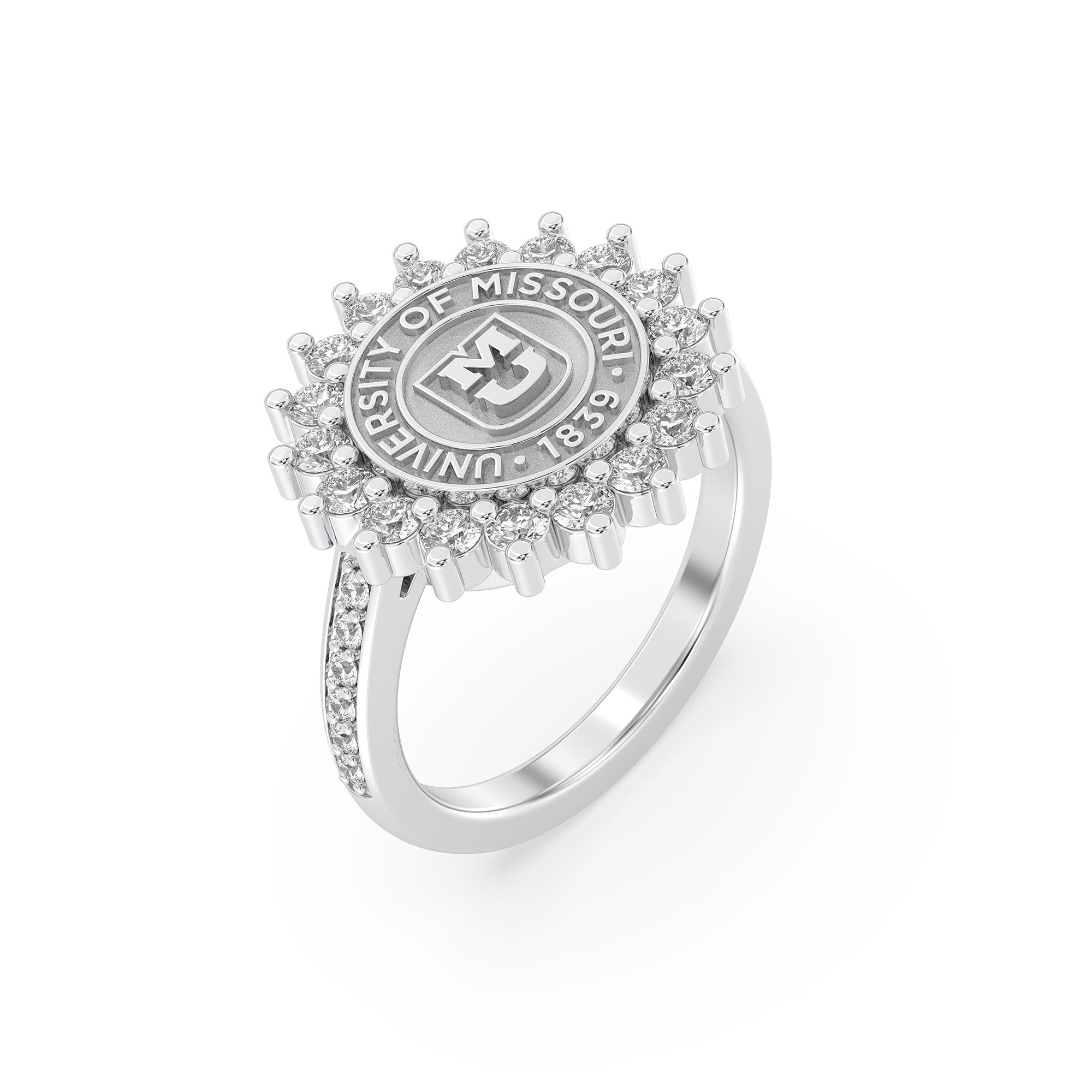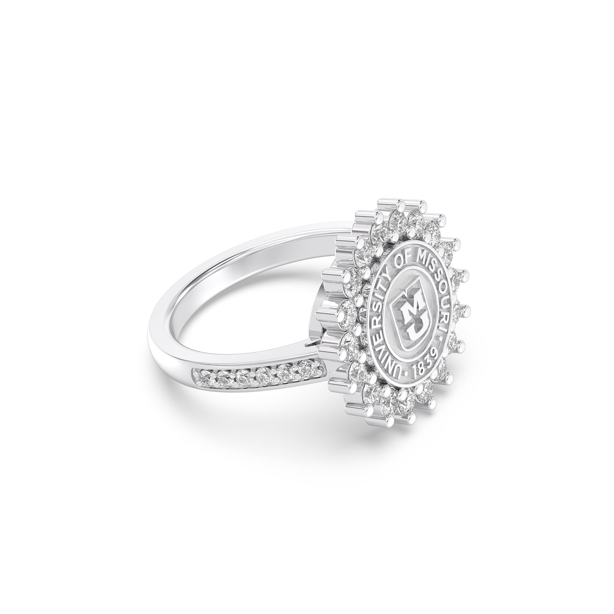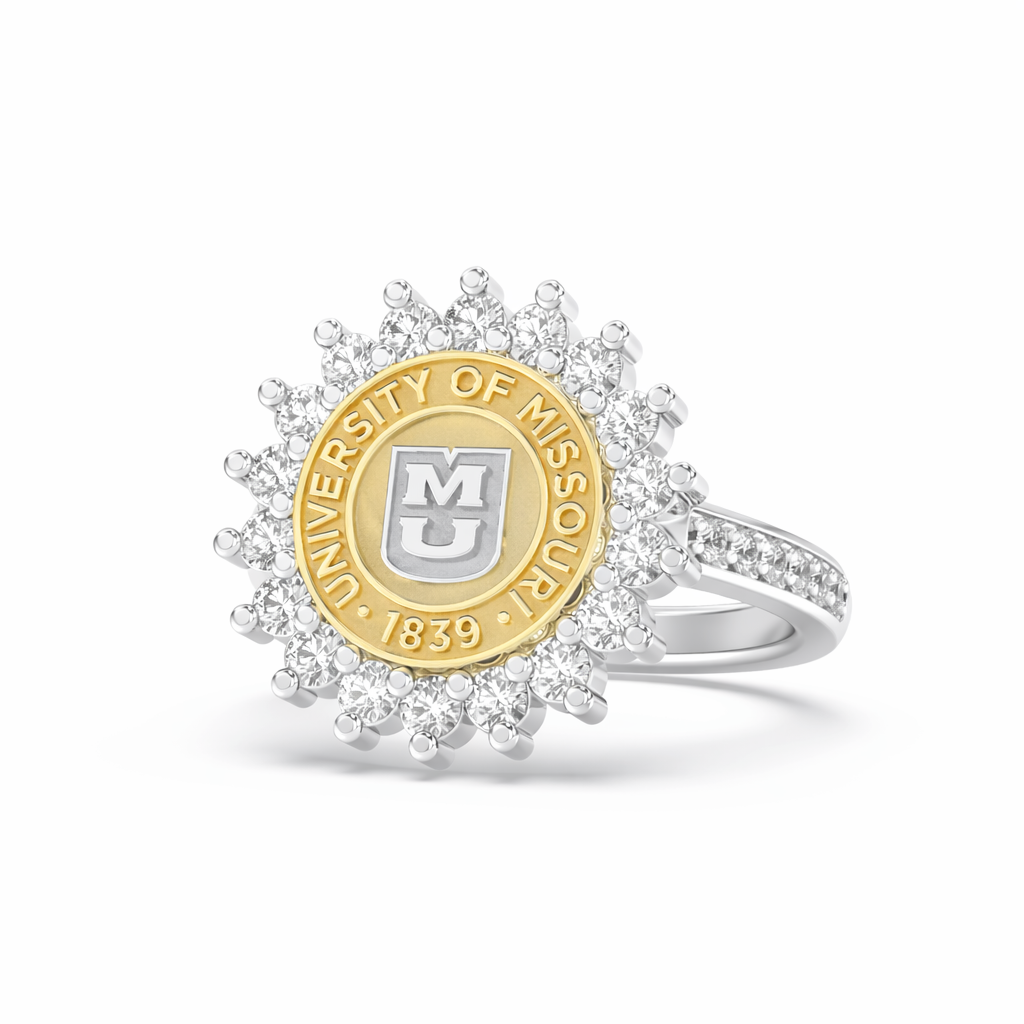 If you're looking for an elegant University of Missouri ring, the 245 Prestige is a fabulous choice. This ring features University of Missouri's officially approved seal, surrounded by a beautiful halo of 2mm stones, creating a tight, uniform look. The 245 Prestige Mizzou ring is the ideal way to honor your Mizzou journey in platinum silver, white gold, or yellow gold!