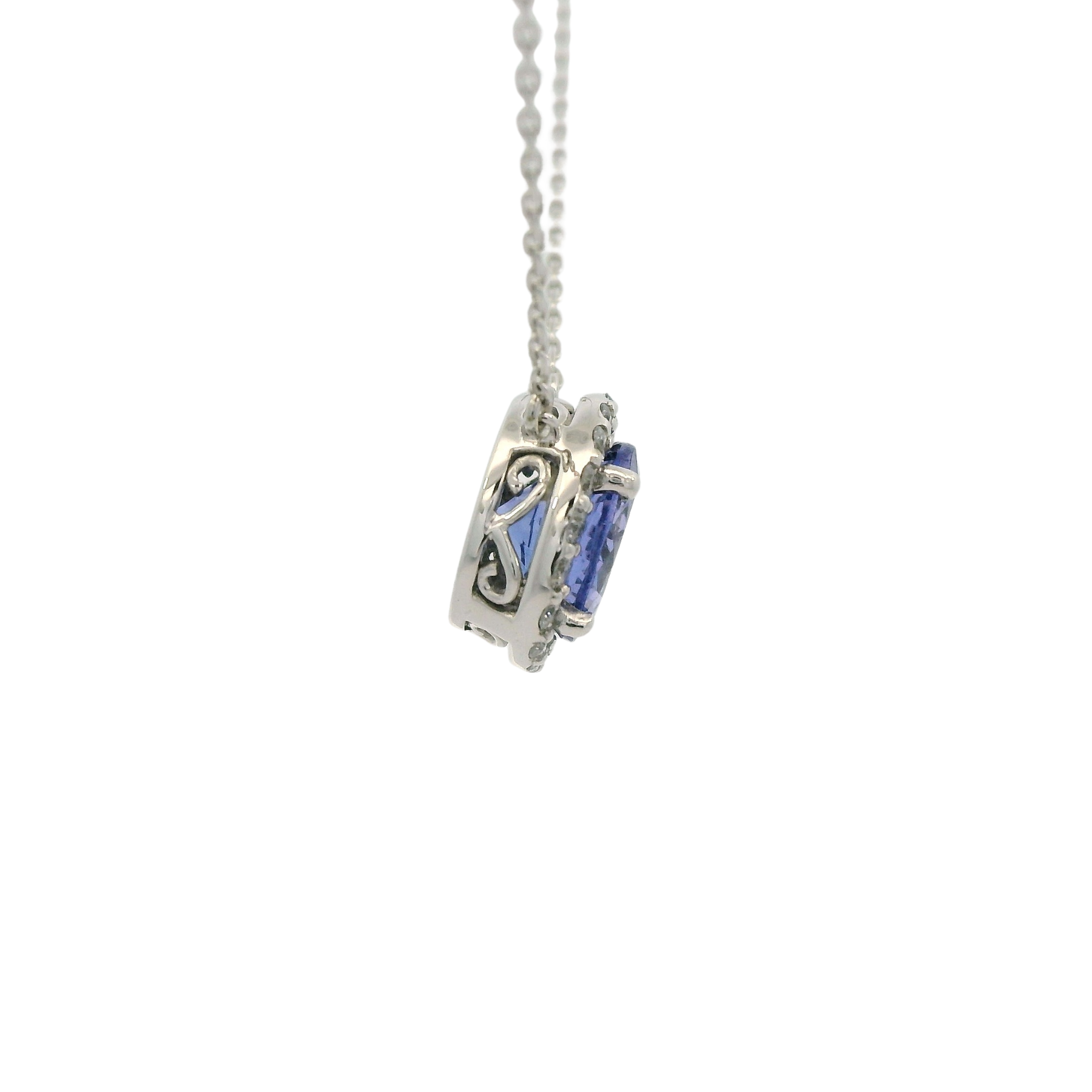 Add a touch of vibrant to your collection with this stunning 1.55 round-cut Tanzanite pendant. The vivid tanzanite radiates a blueish-purple sparkle from every angle. It’s beautifully surrounded by a halo of round lab-grown diamonds, enhancing the gemstone’s natural sparkle and creating a breathtaking contrast against the crisp white gold setting.