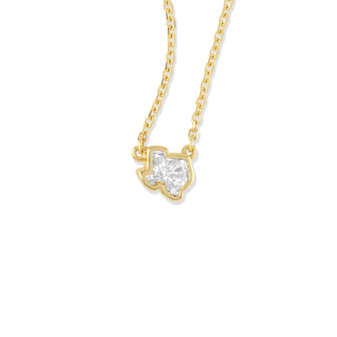 The diamond is bezel set in solid 14k yellow gold, creating a sleek, modern silhouette that securely frames the stone while enhancing its natural brilliance. Suspended from a classic 20" yellow gold 1mm cable chain, this necklace is perfect for everyday wear or meaningful gifting—whether honoring Texas roots, celebrating a milestone, or simply showcasing a love for distinctive fine jewelry.