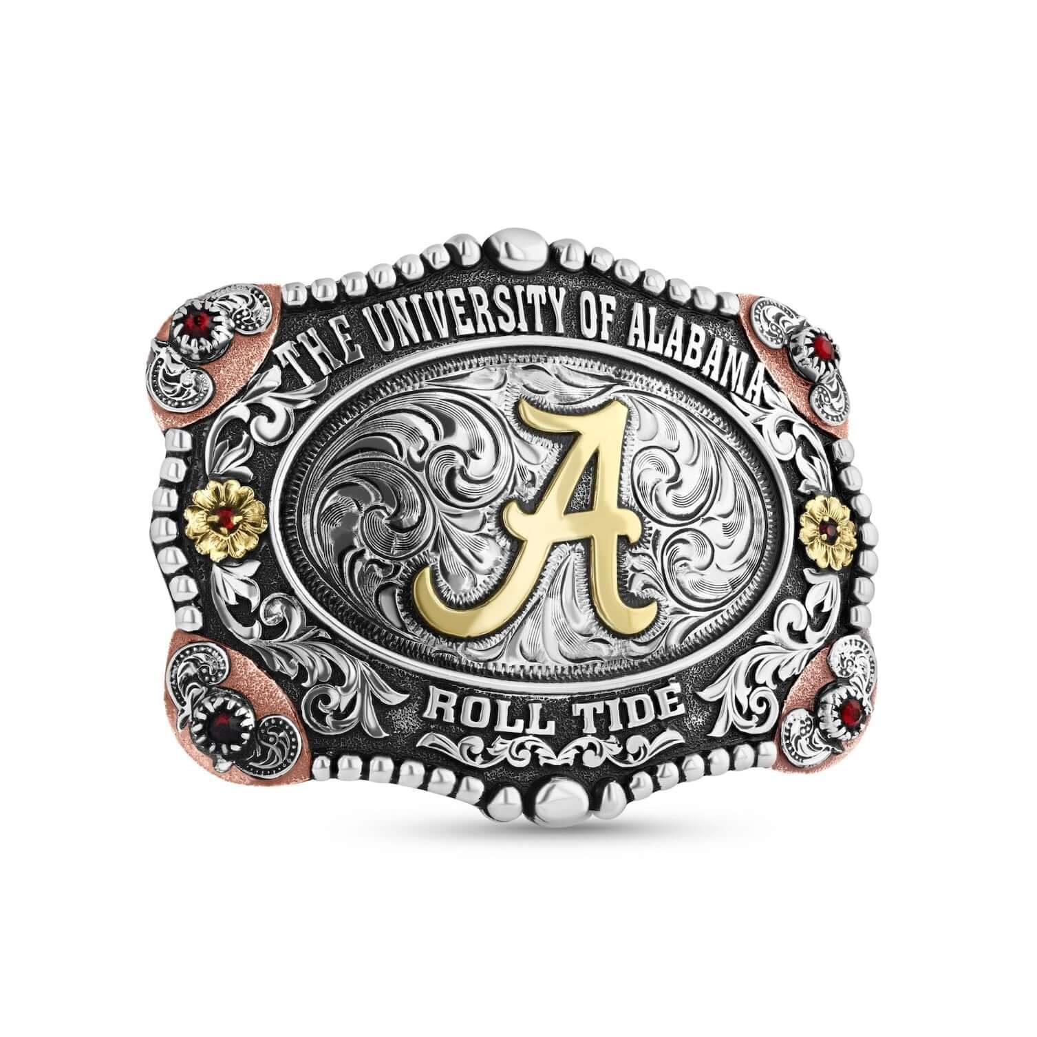 Crafted by San Jose Jewelers, “The Spur” features beaded edges, copper corner accents, and intricate German silver scrollwork framing the centerpiece. A striking gold “A” emblem, red cubic zirconia stones, and the iconic “Roll Tide” engraving highlight your Alabama spirit. Built with jeweler’s bronze and durable silver tones, this buckle blends timeless design with rugged quality.